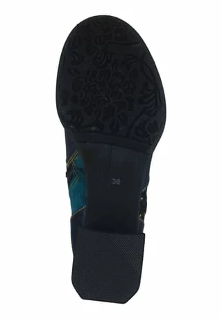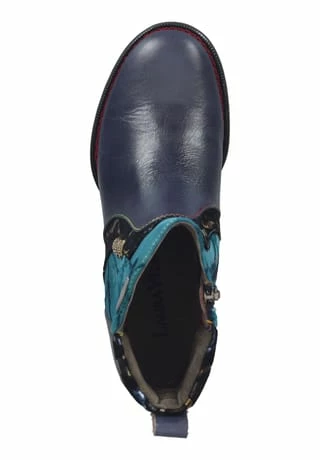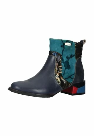 Ein absoluter Eyecatcher ist diese extravagante Stiefelette von Laura Vita. Das Modell besticht durch hochwertiges Leder und Textileinsätze mit auffälligem Print und goldenen Details. Für einen angenehmen Komfort sorgt die gepolsterte Decksohle sowie der innen liegende Reißverschluss.