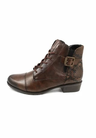 Schöne Damen Stiefeletten von Remonte aus einem feinen hochwertigem geprägten Glattleder. Innen ist der Schuh mit einem cromfrei gegerbtem Leder ausgestattet. Der Schuh hat eine normale Weite. Der stabile Blockabsatz hat eine Höhe von cirka 2 cm. Die Laufsohle ist aus Krepp. Der Artikel verfügt über einen Schnürverschluss. Die Schuhgröße fällt regulär aus.
