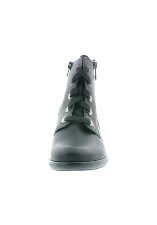 Schöne Damen Stiefeletten von Rieker aus einem feinen hochwertigem Kunstleder. Innen ist der Schuh mit Kunstleder augestattet. Der stabile Blockabsatz hat eine Höhe von cirka 3 cm. Die Laufsohle ist aus Krepp. Der Artikel verfügt über einen Schnürverschluss. Die Schuhgröße fällt regulär aus.