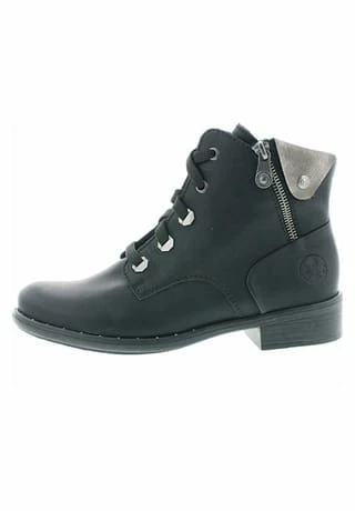 Schöne Damen Stiefeletten von Rieker aus einem feinen hochwertigem Kunstleder. Innen ist der Schuh mit Kunstleder augestattet. Der stabile Blockabsatz hat eine Höhe von cirka 3 cm. Die Laufsohle ist aus Krepp. Der Artikel verfügt über einen Schnürverschluss. Die Schuhgröße fällt regulär aus.