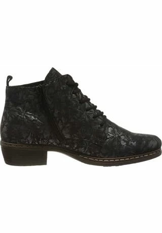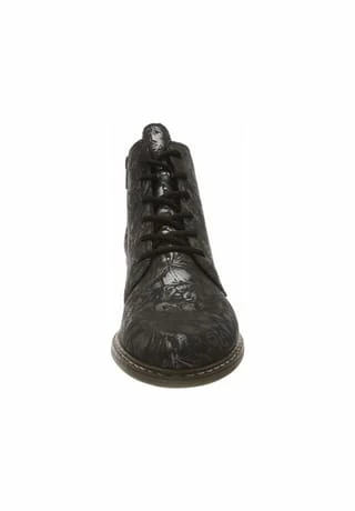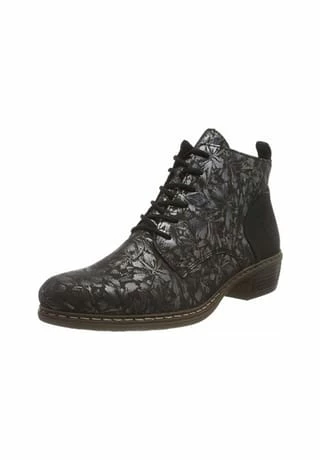 Schöne Damen Stiefeletten von Rieker aus einem feinen hochwertigem Kunstleder. Innen ist der Schuh mit Kunstleder augestattet. Der stabile Blockabsatz hat eine Höhe von cirka 3 cm. Die Laufsohle ist aus Krepp. Der Artikel verfügt über einen Schnürverschluss. Die Schuhgröße fällt regulär aus.