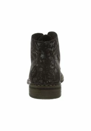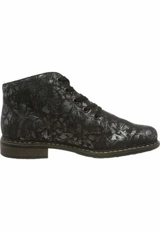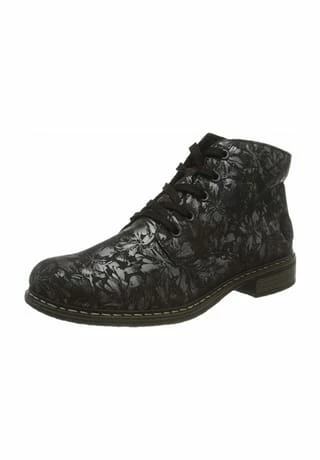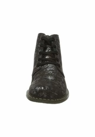 Schöne Damen Stiefeletten von Rieker aus einem feinen hochwertigem Kunstleder. Innen ist der Schuh mit Kunstleder augestattet. Der stabile Blockabsatz hat eine Höhe von cirka 3 cm. Die Laufsohle ist aus Krepp. Der Artikel verfügt über einen Schnürverschluss. Die Schuhgröße fällt regulär aus.